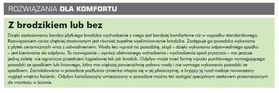Komfort utrzymania w czystości. Sprzyjają mu sprzęty podwieszane na stelażach, stosowane coraz częściej zamiast tradycyjnych stojących, oraz specjalne powłoki, którymi pokrywa się drzwi kabin prysznicowych, umywalki, brodziki i wanny.